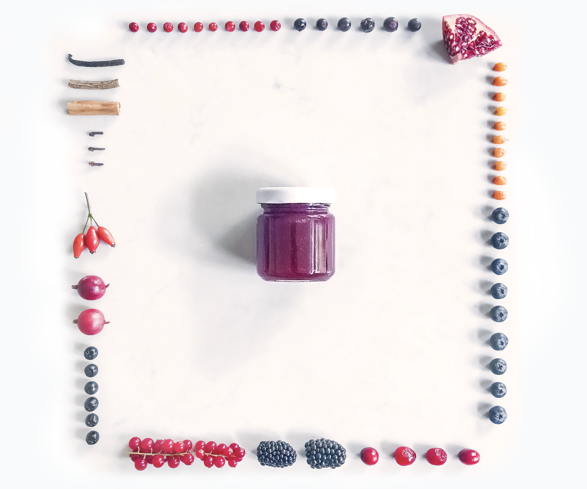 Unser Ziel war es, einen Antioxidantien-Shot aus Beeren mit dem höchsten natürlichen Antioxidantienwert der Welt zu kreieren. Deshalb haben wir uns für ein Beerenshot-Rezept mit einer Vielzahl von Wildbeeren entschieden, wie z.B. Blaubeeren, Heidelbeeren, Johannisbeeren, Schwarzen Johannisbeeren und Sanddornbeeren. Die Wildbeeren, Granatapfel und Gewürze enthalten reichlich natürliche Antioxidantien, einschließlich Vitamin C (105% der RI) und Vitamin E (36% der RI), die zur Bekämpfung freier Radikale beitragen. Dadurch helfen Antioxidantien, gesunde Körperzellen zu schützen. Vitamin C ist auch gut für die Haut und hilft, UV-Schäden zu schützen. Darüber hinaus trägt Vitamin C zusammen mit dem Vitamin B6 in diesem Antioxidantien-Shot zu einer guten Resistenz und Unterstützung deines Energielevels bei.