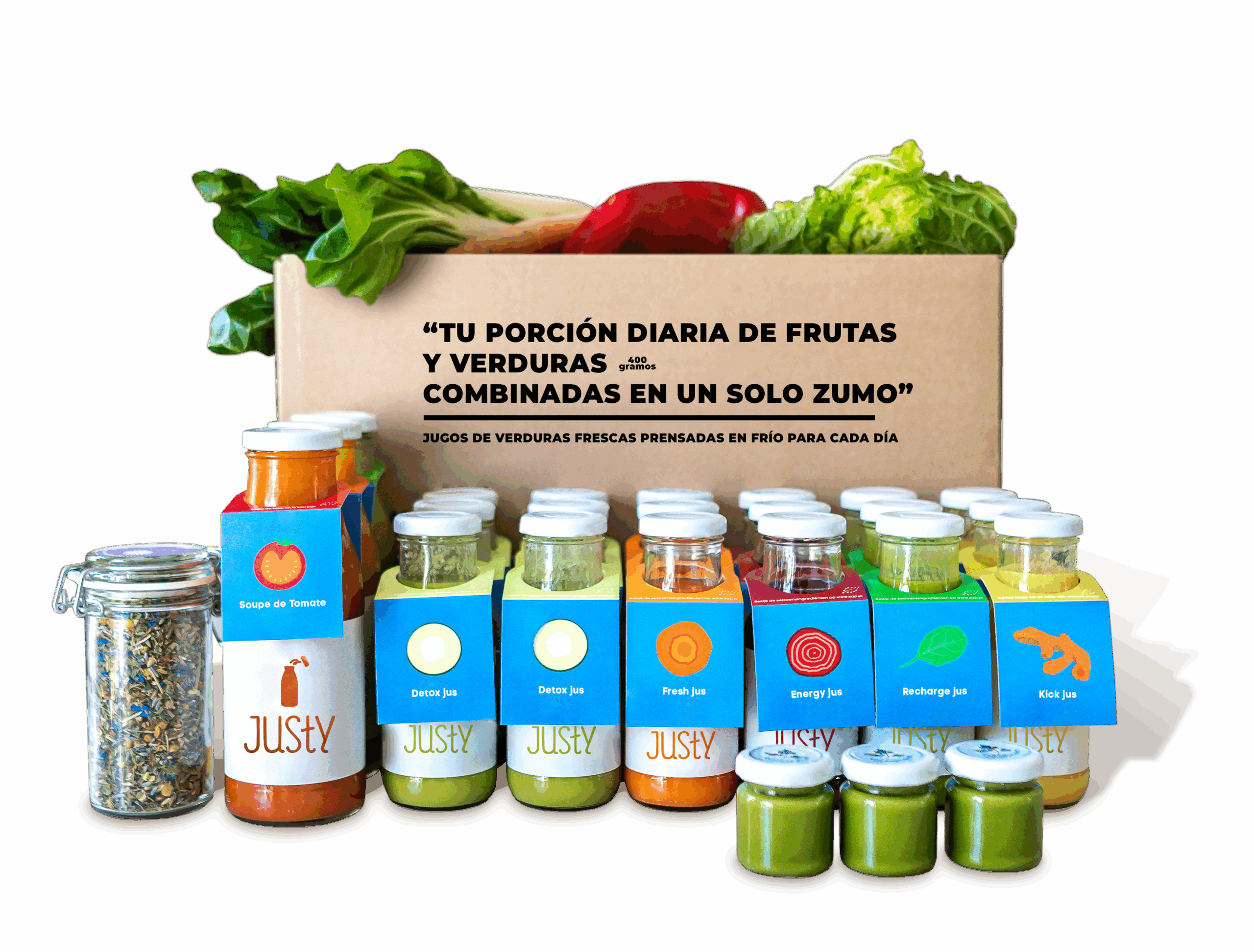 ¿Cuál es el secreto del éxito de Justy? Sabor, salud y respeto por el medio ambiente. Creamos zumos con más de 10 ingredientes para asegurar las mezclas de verduras más deliciosas. Gracias a nuestro método de prensado lento y congelación inmediata, preservamos al máximo los beneficios saludables. Nuestros zumos se envasan en botellas de cristal, haciéndolos completamente ecológicos. Nos ocupamos del mundo, y tú cuidas de tu cuerpo. Juntos estamos construyendo un futuro más saludable.