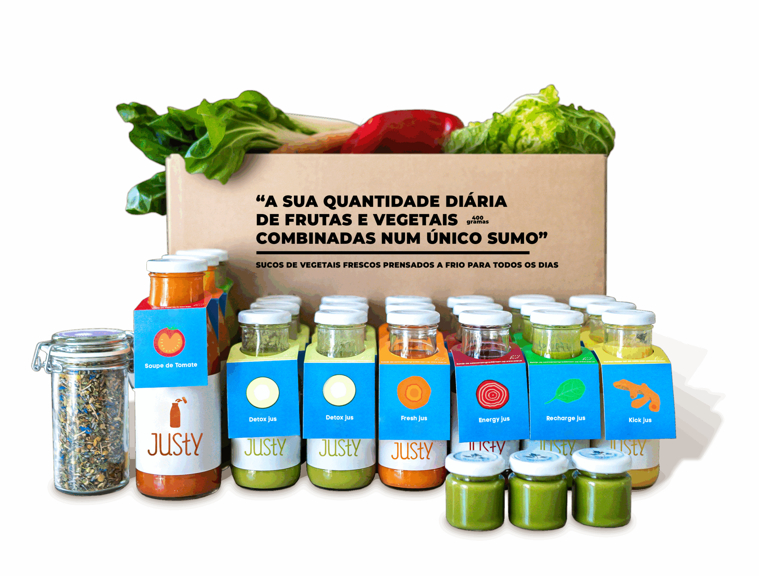O segredo do sucesso da Justy? Sabor, saúde e respeito pelo ambiente. Criamos sumos com mais de 10 ingredientes para garantir as combinações de vegetais mais deliciosas. Ao usar o nosso método de slow juicing e congelação instantânea, preservamos ao máximo os benefícios para a saúde. Os nossos sumos são engarrafados em garrafas de vidro, tornando-os completamente ecológicos. Nós cuidamos do mundo, e você cuida do seu corpo. Juntos estamos a construir um futuro mais saudável.